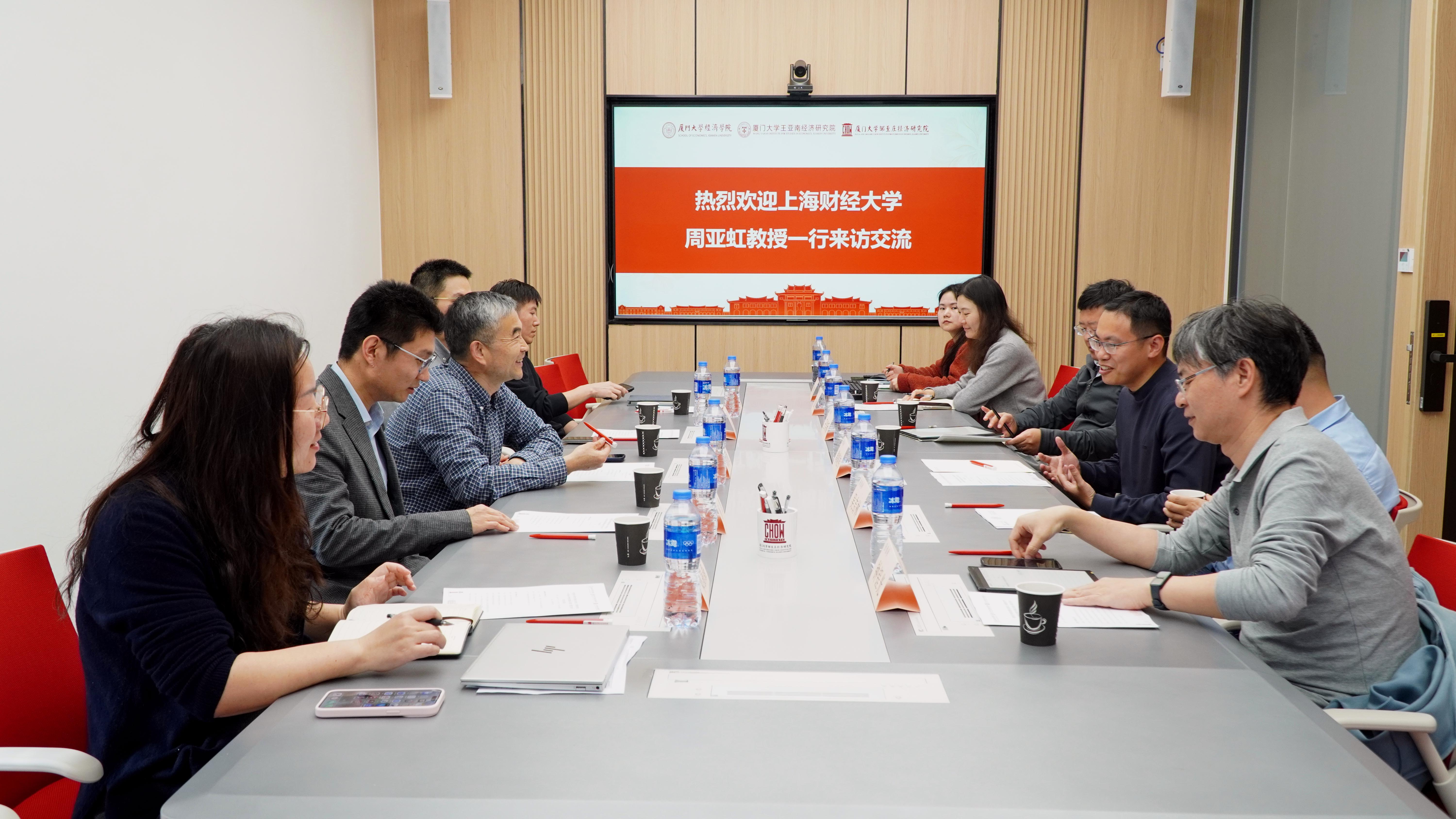 2026年3月27日,数理经济学教育部重点实验室(上海财经大学)主任、上海财经大学经济学院院长周亚虹教授,计量经济学系主任张征宇教授,数理经济学教育部重点实验室执行主任杨凯副教授等一行访问厦门大学经济学科,与计量经济学教育部重点实验室(厦门大学)团队进行座谈交流,共谋协同发展。计量经济学教育部重点实验室(厦门大学)副主任韩晓祎教授、吴吉林教授、钟锃光正高级工程师,福建省统计科学重点实验室副主任王学新副教授,邹至庄经济研究院办公室负责人邓晶晶,相关工程师、行政人员等参加座谈。